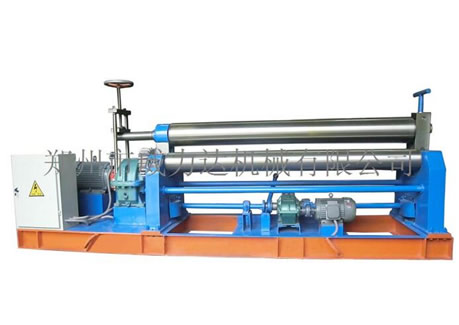 該機為手動對稱式三輥卷板機,兩下輥為主動固定輥,正、反向旋轉運動有主電機帶動減速機提供的彎曲扭矩來實現;上輥在兩下輥中央對稱位置做升降運動,上輥升降運動靠手板手輪帶動升降絲桿來實現。該機結構簡單,操作方便,適合8毫米以下板材。